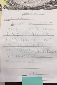 First, students used the plan sheet below to write their three moon facts on. Then they used the friendly letter template to write their letter. They added pictures to display with their letters in the hallway.